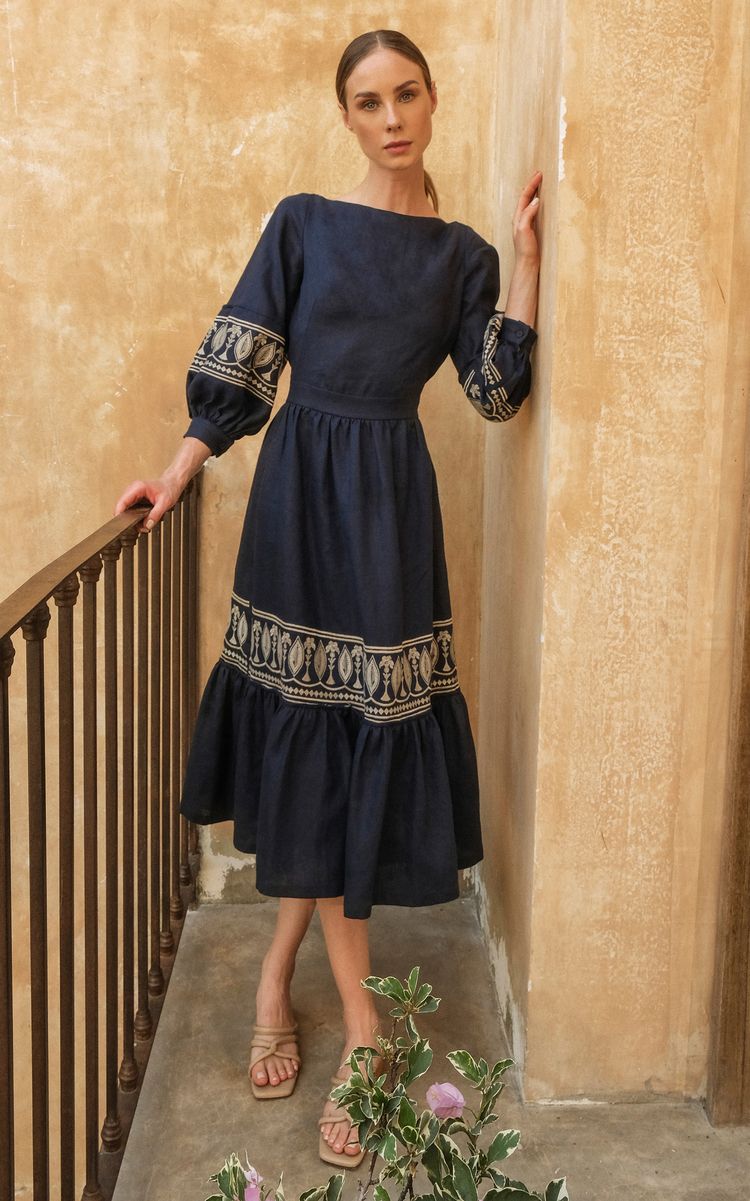Este elegante vestido de corte midi es de color azul marino oscuro y presenta detalles bordados en un tono dorado claro. El diseño destaca por su escote en forma de barco y sus mangas tres cuartos abullonadas, también adornadas con el mismo bordado. La cintura ajustada crea una silueta definida, y la falda termina en un volante fruncido con un borde bordado, lo que le da un toque sofisticado y artesanal.